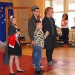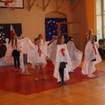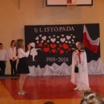 Następnie rozpoczęła się część artystyczna, która została przygotowana przez uczniów klasy IV c i VI a. Uczniowie przybliżył zgromadzonym kolegom i gościom historie naszego kraju – czasów, gdy Polska straciła niepodległość i zniknęła na 123 lata z mapy świata. Opowiadali o walce z zaborcami, patriotyzmie naszych przodków. Scenariusz obejmował treści historyczne, pieśni, wiersze i tańce. W przystępny i obrazowy sposób przedstawiono losy naszej Ojczyzny, począwszy od zaborów, a skończywszy na roku 1918. Młodzież szkolna z zainteresowaniem i w skupieniu oglądała i wysłuchała tej szczególnej lekcji historii. Po zakończeniu programu głos zabrała Pani Dyrektor Małgorzata Zabłocka, dziękując uczniom za piękne zaprezentowanie utworów literackich i muzycznych, a także nauczycielom przygotowującym program: p. Justynie Zabłockiej i p. Bożenie Król-Jałowieckiej, p. Mariuszowi Pukaczowi.