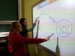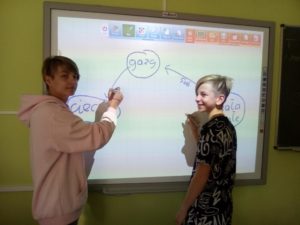 Ten nowoczesny sprzęt został zainstalowany w gabinetach: informatycznym, matematyczno-fizycznym, językowym w kl. I-III. Urządzenia te posiadają duże ekrany projekcyjne, z których obraz jest widoczny dla wszystkich słuchaczy w sali wykładowej lub uczniów w klasie. Powierzchnia ekranów jest czuła na dotyk, a monitor interaktywny umożliwia pracę wielu osobom na raz ( do 10 osób). Wygląda to tak, jak byśmy pracowali na bardzo dużym tablecie. Dodatkowo można, jak w przypadku tradycyjnych tablic, pisać i rysować. Ten nowoczesny sprzęt pozwala: obsługiwać programy z komputera lub aplikacje wgrane na monitorze, prowadzić interaktywne lekcje z wykorzystaniem zasobów internetowych w tym platform e-leargingowych, a dzięki wbudowanym głośnikom i W-fi wyświetlać filmy i materiały edukacyjne z każdego miejsca.