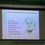 Mniej więcej godzinę później wszyscy ponownie znaleźli się w licealnej auli. Zanim jednak odbyła się ceremonia konkursowa, uczennice i uczniowie ząbkowickiego LO zaprezentowali program nawiązujący do postaci Gustawa Herlinga-Grudzińskiego. Rok 2019 został bowiem ogłoszony przez Sejm RP rokiem tego wybitnego polskiego pisarza, eseisty i krytyka literackiego. Biografia twórcy, jego zapatrywania społeczne i estetyczne, wyznawane wartości ideowe i cechy charakteru stały się kanwą interesującej i żywej narracji. Teksty Gustawa Herlinga-Grudzińskiego, wypowiedzi o nim oraz piosenki stanowiące niejako odzwierciedlenie myśli, z jakimi się utożsamiał pisarz, jak się okazało nadal inspirują.