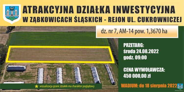 Burmistrz Ząbkowic Śląskich ogłasza I przetarg ustny nieograniczony, na sprzedaż nieruchomości gruntowej niezabudowanej położonej w Ząbkowicach Śląskich, działka nr 7, AM-14, ob. Sadlno o pow. 1,3670 ha.