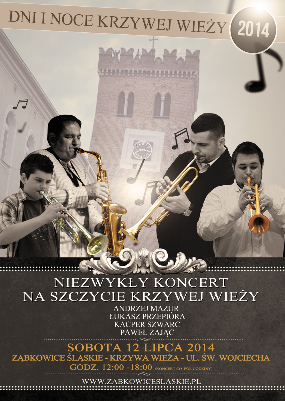 Na ulicy Św. Wojciecha oraz ulicach przyległych rozbrzmiewać będą dźwięki niezwykle przyjemne dla ucha. Ze szczytu wieży rozbrzmiewać będą dźwięki płynące z trąbek, saksofonu i bębnów. To będzie niezwykły i niecodzienny koncert LIVE na szczycie Krzywej Wieży (sobota, 12-18 – co pół godziny) w wykonaniu: Andrzeja Mazura, Łukasza Przepióry, Kacpra Szwarca i Pawła Zająca. Swoje doznania muzyczne zwiększą wszyscy ci, którzy wejdą na szczyt wieży.