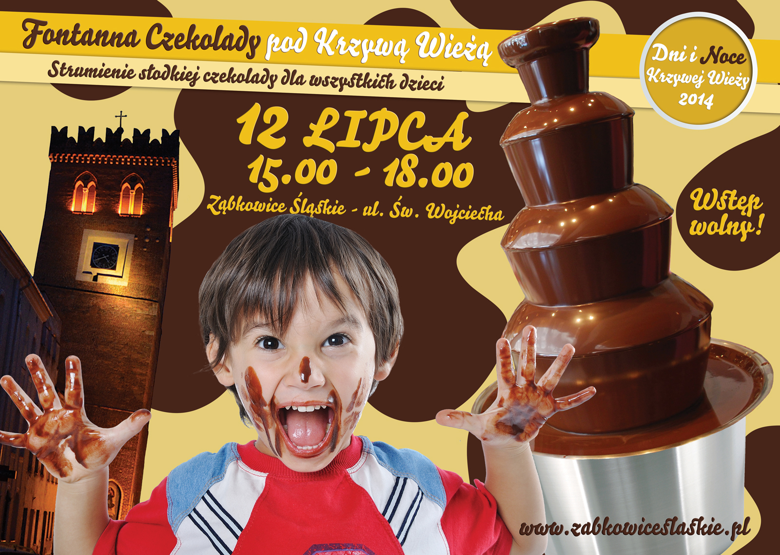 Pod Krzywą Wieżę zapraszamy wszystkie dzieci na fontannę czekolady (sobota, 15-18) – strumieniami popłynie mleczna oraz biała czekolada. To będzie słodki raj dla dzieci. Oprócz fontanny pod Krzywą Wieżą dzieci będą mogły bezpłatnie wymalować twarze(sobota 11-14 Rynek, 14-18 pod Krzywą Wieżą), oraz obejrzeć „Baśń o dwóch braciach” (sobota, 16-18) według znakomitej baśni Gustawa Morcinka – „O ubogim szewcu i chciwym młynarzu” pokazującej świat, gdzie dobro jest nagradzane a zło piętnowane. Baśń i warsztaty teatralne dla dzieci poprowadzi Akademia Wyobraźni – Wędrowny Teatr Lalkowy z Wrocławia.