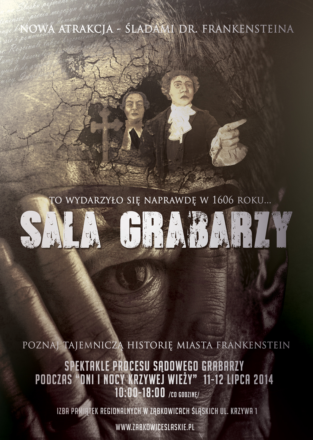 Nie zabraknie atrakcji z dreszczykiem – w końcu Ząbkowice Śląskie to Miasto Frankensteina. Zapraszamy na inscenizacje (spektakle) w Sali Grabarzy w ramach Szlaku dr. Frankensteina. Każdy kto odwiedzi Izbę Pamiątek Regionalnych, przy ul. Krzywej będzie mógł wziąć udział w procesie i przenieść się do mrocznych czasów roku 1606 miasta Frankenstein (spektakle: piątek-sobota od 10:00 do 18:00. UWAGA! Atrakcje Śladami dr. Frankensteina (bez spektaklu będzie można zwiedzać aż do 24:00)
