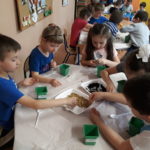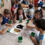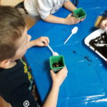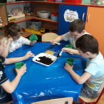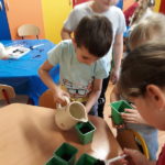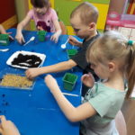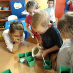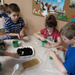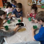 Zamieniając się w prawdziwych ogrodników – wsypywały ziemię do pojemników, a następnie siały owies. Obowiązkowo po zasianiu ziarna, podlewały swoją małą uprawę, by urosła na Święta Wielkiej Nocy. Małe, zielone doniczki znalazły swoje miejsce na oknie, gdzie bacznie będą obserwowane i pielęgnowane przez naszych najstarszych przedszkolaków. Brawo Tygryski!