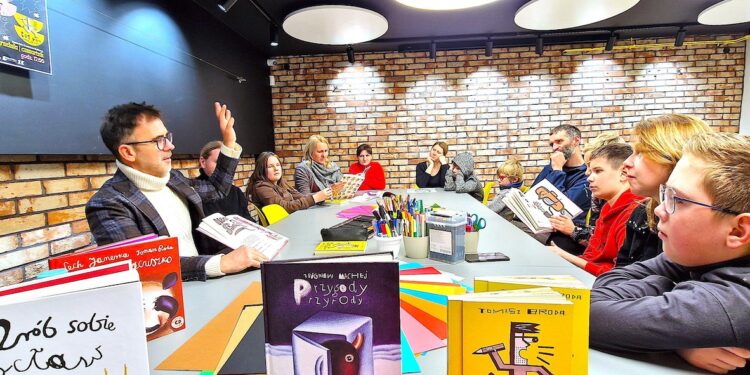 Wszak literatura jest świetnym partnerstwem dla sztuki i na odwrót – wyjaśniał podczas międzypokoleniowego spotkania autorskiego Tomasz Broda – uznany rysownik, ilustrator, pedagog, profesor wrocławskiej ASP, twórca masek i lalek wykonanych z przedmiotów codziennego użytku, które prezentował w autorskich programach telewizyjnych. Artysta opowiedział o powstaniu rysunkowej autobiografii „Coś pan zmalował!” oraz autorskich książek „Zróbmy sobie Wrocław” czy „Bookface. Księga twarzy pisarzy”, jak również o pracy ilustratora książek dla dzieci. Nie zabrakło rozmów o technice portretowania, rysunku oraz wspólnego tworzenia portretów i twórczej interakcji z uczestnikami.