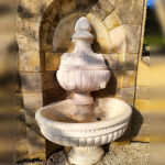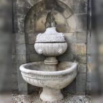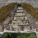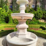 Prace konserwatorskie fontanny na Tarasie Podkowiastym obejmowały uzupełnienia oraz odtworzenie brakujących fragmentów kamiennych, konserwację istniejących fragmentów oryginalnych i odtworzenie wewnętrznej instalacji zasilająco-odpływowej. Pochodzący z około 1910 roku wodotrysk ma kształt kielicha o kolumnowej, niskiej, stopie i misie w formie puklowanej czary. Przykrywa wazy o bogatej roślinno-geometrycznej ornamentyce z dwoma maszkaronami na bokach zwieńczona była częściowo wtopioną w ścianę niszy szyszką, która została odtworzona w ramach realizowanych prac naprawczych. Neorenesansowa fontanna jest prawdopodobnie wyrobem karraryjskim, sprowadzonym przez właścicieli zamku w pierwszym etapie rozpoczętej w 1908 r. rozbudowy i modernizacji zamku i jego otoczenia.