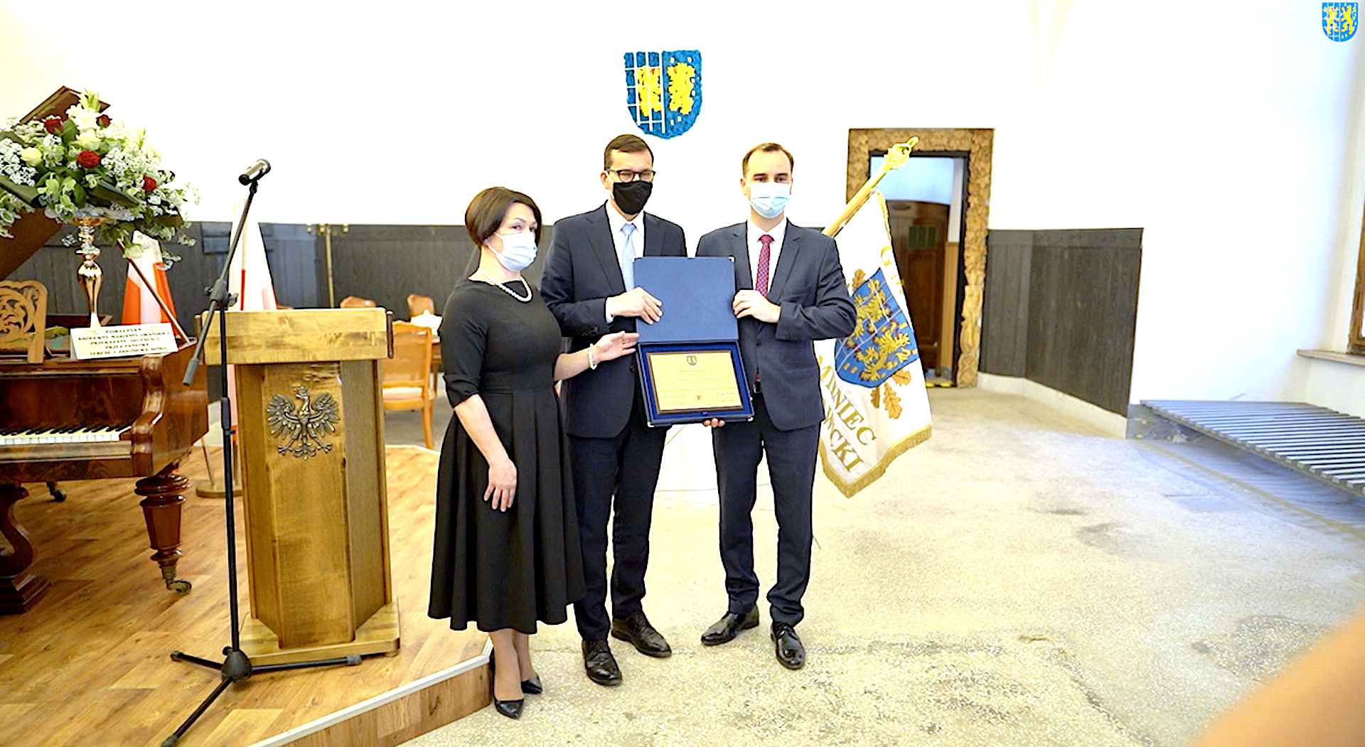 W czasie wizyty premier Mateusz Morawiecki przyjął tytuł Honorowego Obywatela Kamieńca Ząbkowickiego, który został mu nadany 24 czerwca 2021 r. Akt tego szczególnego wyróżnienia wręczyli burmistrz Marcin Czerniec, przewodnicząca Rady Miejskiej Bernadeta Chodasewicz, wiceprzewodniczący Sylwia Demidowicz i Tadeusz Cenarski oraz grupa radnych Gminy Kamieniec Ząbkowicki.
