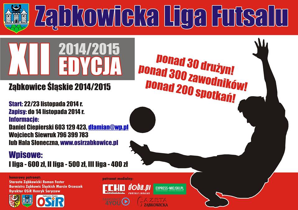 Czytaj dalejXII edycja Ząbkowickiej Ligi Futsalu rusza już 22 listopada 2014 r. Po raz kolejny około 300 zawodników co tydzień będzie...