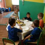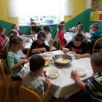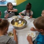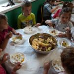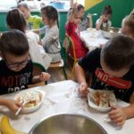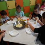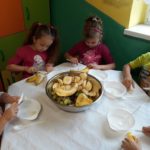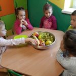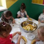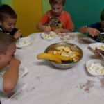 Dlatego też w ramach tygodniowego tematu o owocach dzieci z grupy „Tygryski” postanowiły zrobić pyszną i zdrową sałatkę owocową. Wykonały sałatki z przyniesionych przez siebie owoców. Sałatka smakowała dzieciom wyśmienicie zwłaszcza, że dodatkiem była bita śmietana i kolorowa posypka mniam!