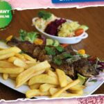 Pstrąg sowiogórski z masłem czosnkowym, pieczonymi ziemniakami i surówką – 41 zł