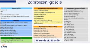 W spotkaniu weźmie udział ok. 80 osób. Wśród zaproszonych są osoby reprezentujące trzy największe związki zawodowe, stowarzyszenie pedagogów oraz 5 przedstawicieli nauczycieli niezrzeszonych, wylosowanych spośród zgłaszających się chętnych. Do wspólnej dyskusji zostały także zaproszone organy prowadzące szkoły, takie jak Związek Miast Polskich, Związek Gmin Wiejskich RP, Związek Powiatów Polskich, Krajowe Forum Oświaty Niepublicznej, Stowarzyszenie Przyjaciół Szkół Katolickich a także politycy wszystkich frakcji parlamentarnych. Ważną grupę stanowią także organizacje rodziców i dzieci m.in. Fundacja Rodzice w Szkole, Stowarzyszenie Rzecznik Praw Dziecka, Związek Dużych Rodzin. Istotna jest też grupa naukowców, ekspertów i organizacji NGO.