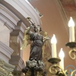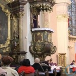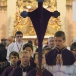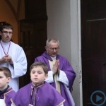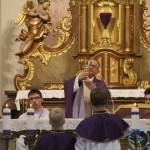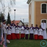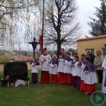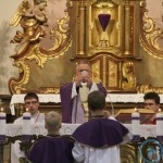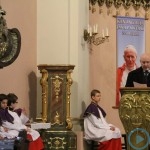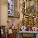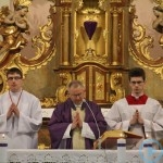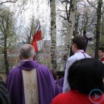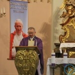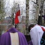Wieczorem w kościele parafialnym pw. Św. Jadwigi została odprawiona Msza św. za Ojczyznę. Celebrujący liturgię ks. Jan Sroka odczytał homilię, jaką miał wygłosić biskup polowy Wojska Polskiego śp. ks. Tadeusz Płoski podczas zaplanowanej na 10 kwietnia 2010 r. Mszy św. w Katyniu (cały tekst homilii dostępny TUTAJ). Hierarcha ten zginął wraz z pozostałymi uczestnikami oficjalnej delegacji Rzeczypospolitej Polskiej, która tego dnia udawała się do Rosji. W kazaniu tym szczególnie poruszające były słowa o „falach zła”, jakie przeszły przez Europę. >> Na naszej historii w XX wieku zaważyły dwa okrutne systemy: faszyzm, którego symbolem jest Oświęcim – Auschwitz, i stalinizm, którego symbolem jest Katyń. Hitler i jego potworne zbrodnie zostały już osądzone i potępione. A Stalin i system komunistyczny winien śmierci milionów ofiar, w tym setek tysięcy Polaków, pozostaje nadal bezkarny. Ten ogrom potwornego bolszewickiego zła nazywamy Golgotą Wschodu. Kaci totalitaryzmu zabijali ludzi, niszczyli ich niezależnie od pochodzenia, rasy, religii… Zbrodnie ludobójstwa państwa totalitarnego nie mogą być w żaden sposób usprawiedliwione… 70 lat temu sowieckie NKWD przystąpiło do wykonywania polecenia Stalina i towarzyszy, którzy postanowili zgładzić tysiące polskich oficerów, policjantów i funkcjonariuszy państwowych uznanych za zdeklarowanych i nierokujących nadziei poprawy wrogów władzy sowieckiej. Nie rokowali nadziei, że da się ich urobić do konsystencji ludzi sowieckich, wobec czego byli wrogami, których należało unicestwić. << Częścią tej homilii była także „Ballada Katyńska” Jacka Kaczmarskiego, w której padły m.in. – jakże aktualne w kontekście roczni Tragedii Smoleńskiej – słowa: >> Jesteście świadkami śmierci, która nie powinna ulec zapomnieniu. <<