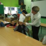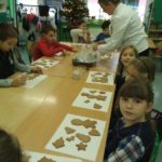 Na początku spotkania pani Marzena pokazała nam odpowiedni strój piekarza – cukiernika, opowiedziała o zasadach panujących w każdej kuchni, zwracając szczególną uwagę na zachowanie czystości w czasie przygotowywania ciasta. Dzieci poznały również recepturę, według której pieczone są pierniki oraz mogły poznać smakiem i zapachem potrzebne przyprawy, wzbogacające aromat świątecznych pierniczków. Następnie otrzymały zestaw wcześniej upieczonych pierników i mogły zająć się najprzyjemniejszym zadaniem jakim było dekorowanie ciastek słodkim lukrem i kolorowymi cukiereczkami. Dzieci były podczas pracy bardzo twórcze i pomysłowe. Oczywiście trudno było się oprzeć tym słodkością i nie skosztować choćby odrobinki.