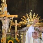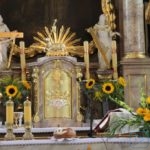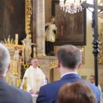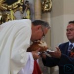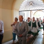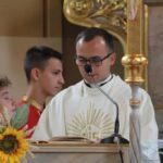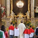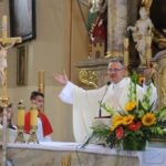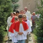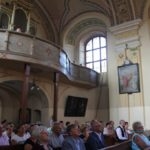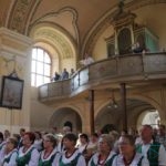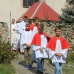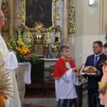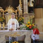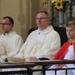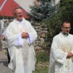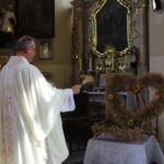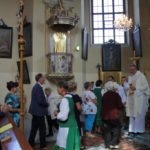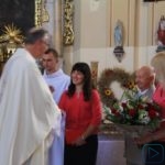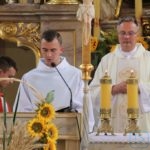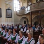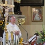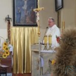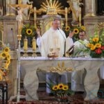 Wedle dobrej tradycji najpierw była Msza św. celebrowana pod przewodnictwem ks. dziekana Wojciecha J. Dąbrowskiego w miejscowym kościele pw. Św. Maternusa. Liturgię poprzedziło procesyjne wprowadzenie korony dożynkowej, po którą księża i ministranci wyszli na plac kościelny. W kazaniu usłyszeć można było – w oparciu o cytowany na wstępie fragment poematu Karola Wojtyły – przesłanie o pracy na roli, jako o służbie. „Wprawdzie ziemia jest warsztatem pracy rolnika, to jednak nie można utożsamiać jej uprawiania z pracą najemną” – stwierdził kaznodzieja i dodał, że „troska o ziemię i jej plony wymaga sięgania wyobraźnią dalej, niż jeden rok, a rolnictwo nie może być grabieżą ziemi, lecz jej pielęgnowaniem”.  Wnętrze XVIII-wiecznego kościoła, dzięki słonecznej aurze, wypełnione było światłem, co niezwykle korespondowało z innymi cytowanymi w kazaniu frazami poezji Karola Wojtyły: „Aż dotąd doszedł Bóg i zatrzymał się krok od nicości, tak blisko naszych oczu. Zdawało się sercom otwartym, zdawało się sercom prostym, że zniknął w cieniu kłosów. A kiedy uczniowie łaknący łuskali kłosy pszenicy, jeszcze głębiej zanurzył się w łan. Uczcie się, proszę, najmilsi, ode mnie tego ukrycia. Ja, gdzie ukryłem się, trwam. Powiedzcie, kłosy wyniosłe, czy wy nie wiecie, gdzie się zataił? Gdzie Go szukać? – kłosy, powiedzcie, gdzie Go szukać w tym urodzaju?” Msza św. zakończyła się życzeniami, jakie w imieniu mieszkańców Sosnowej, skierowane zostały do ks. dziekana Wojciecha J. Dąbrowskiego z racji 25-lecia jego święceń kapłańskich.