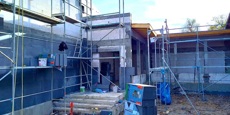 Sprzyjająca dotąd, jak nigdy o tej porze roku, sprawia, że kolejne tygodnie na placu budowy sali gimnastycznej w Grodziszczu napawają optymizmem.
