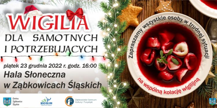 Zbliżają się Święta Bożego Narodzenia. Gmina Ząbkowice Śląskie, wychodząc naprzeciw osobom samotnym i potrzebującym organizuje 23 grudnia 2022 r. w piątek o godz. 16:00 w Hali Słonecznej w Ząbkowicach Śląskich WSPÓLNĄ WIGILIĘ.
