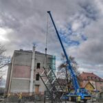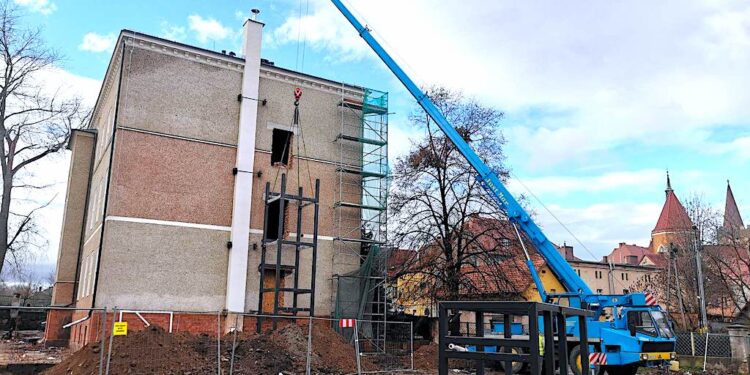 Żyjemy świętami, a tymczasem na placu (prze)budowy budynku byłego liceum na potrzeby budynku biurowego wykonawca zaczął instalować konstrukcję windy zewnętrznej.